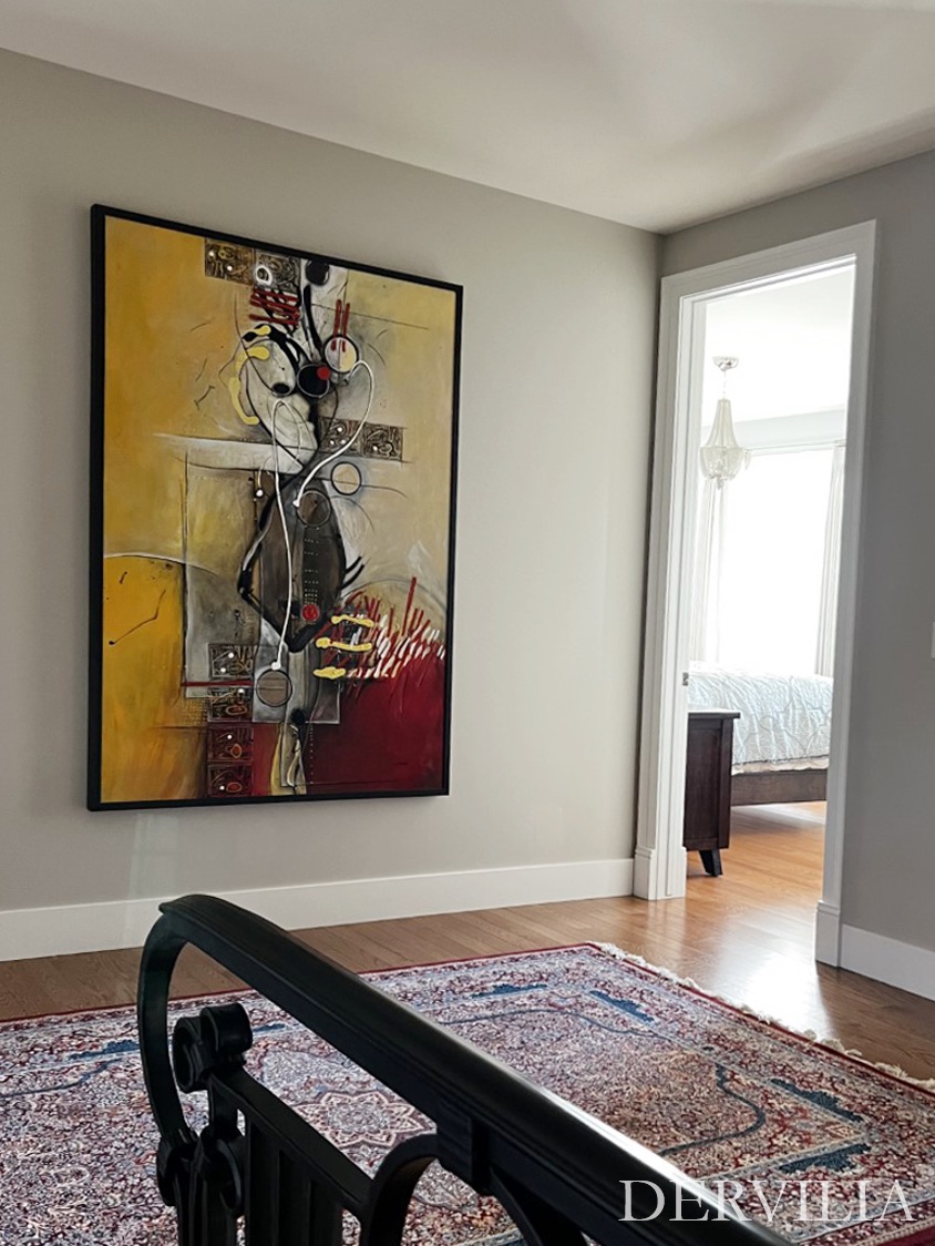 Large abstract painting displayed along a hallway overlooking a stair landing, with warm wood floors and natural light, illustrating Dervilia’s art-led approach to visual flow and spatial connection within the home.