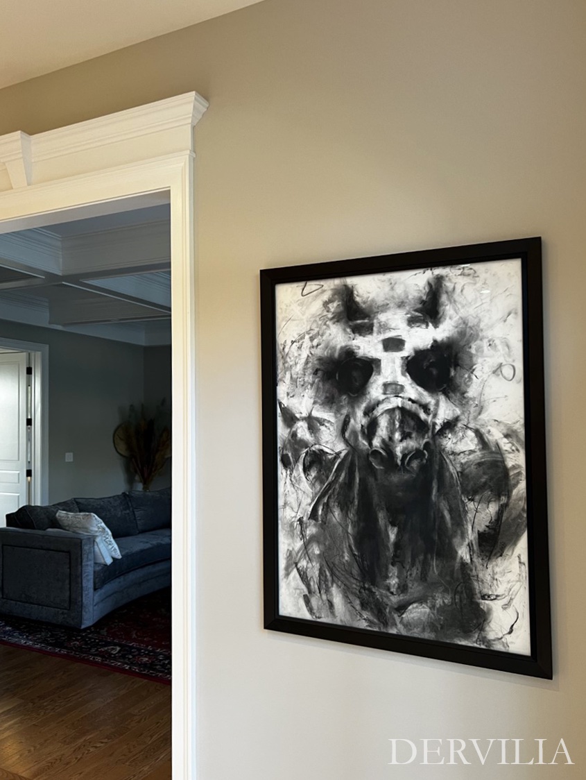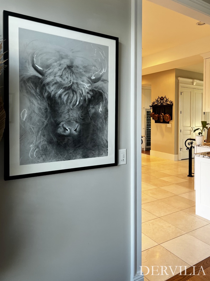 Large monochrome artwork installed on a transitional interior wall, using contrast and scale to create a focal point between adjoining living spaces.