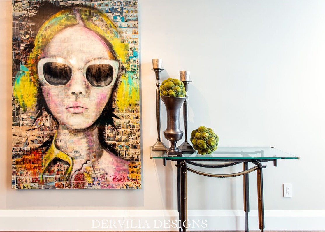 Large contemporary figurative artwork featuring a stylized portrait, paired with a glass console table and sculptural objects, showcasing Dervilia’s art-led approach to contrast, expression, and curated modern interiors.