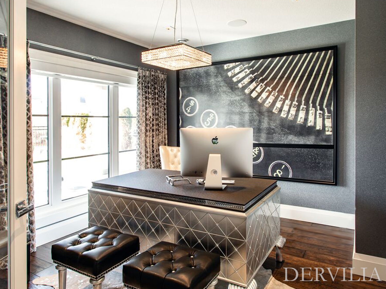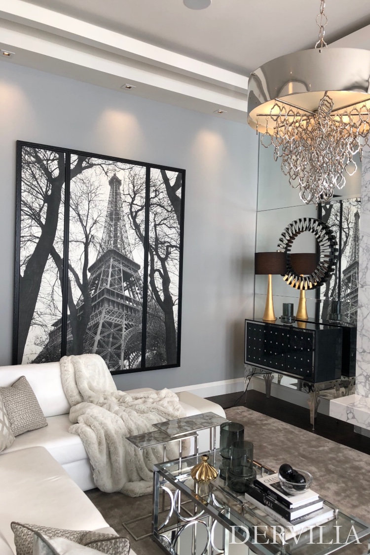 Sophisticated living area styled around large-scale black-and-white artwork, reflective furniture, and a sculptural chandelier, demonstrating Dervilia’s art-first approach to layered, expressive interior design.