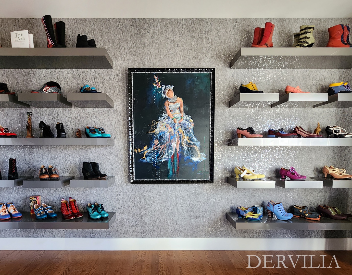 Statement figurative artwork centered within a symmetrical wall of floating shelves displaying curated footwear and objects, showcasing Dervilia’s art-led approach to composition, balance, and expressive interior design.