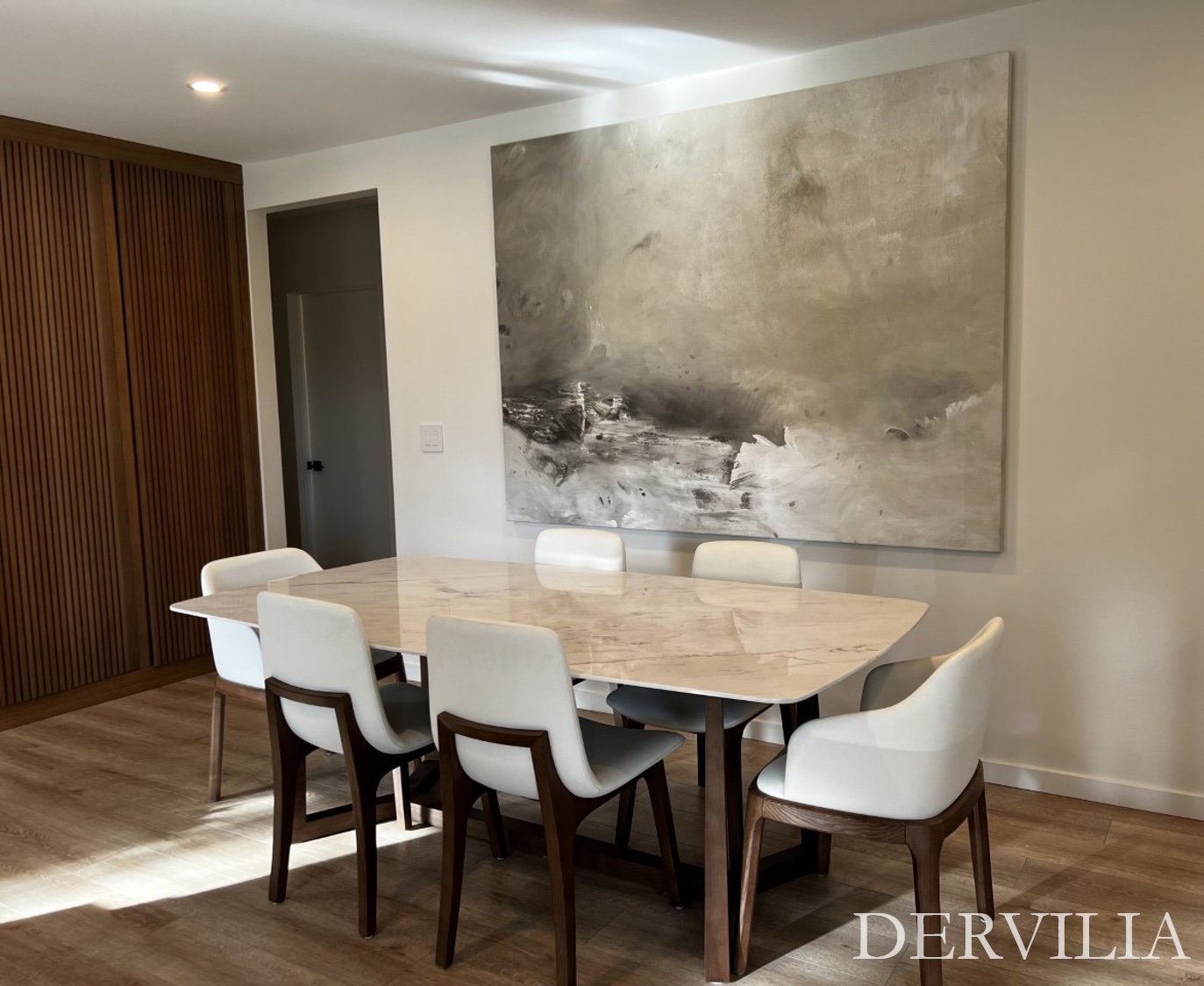 Contemporary dining area featuring a marble table, upholstered chairs, and a large abstract painting as the focal point, reflecting Dervilia’s art-led approach to modern interior composition and balance.