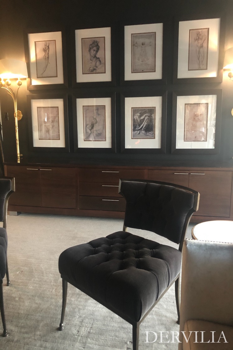 Symmetrical gallery wall featuring a series of framed classical drawings displayed above custom cabinetry, paired with sculptural seating and soft lighting, illustrating Dervilia’s refined approach to art curation and interior balance.