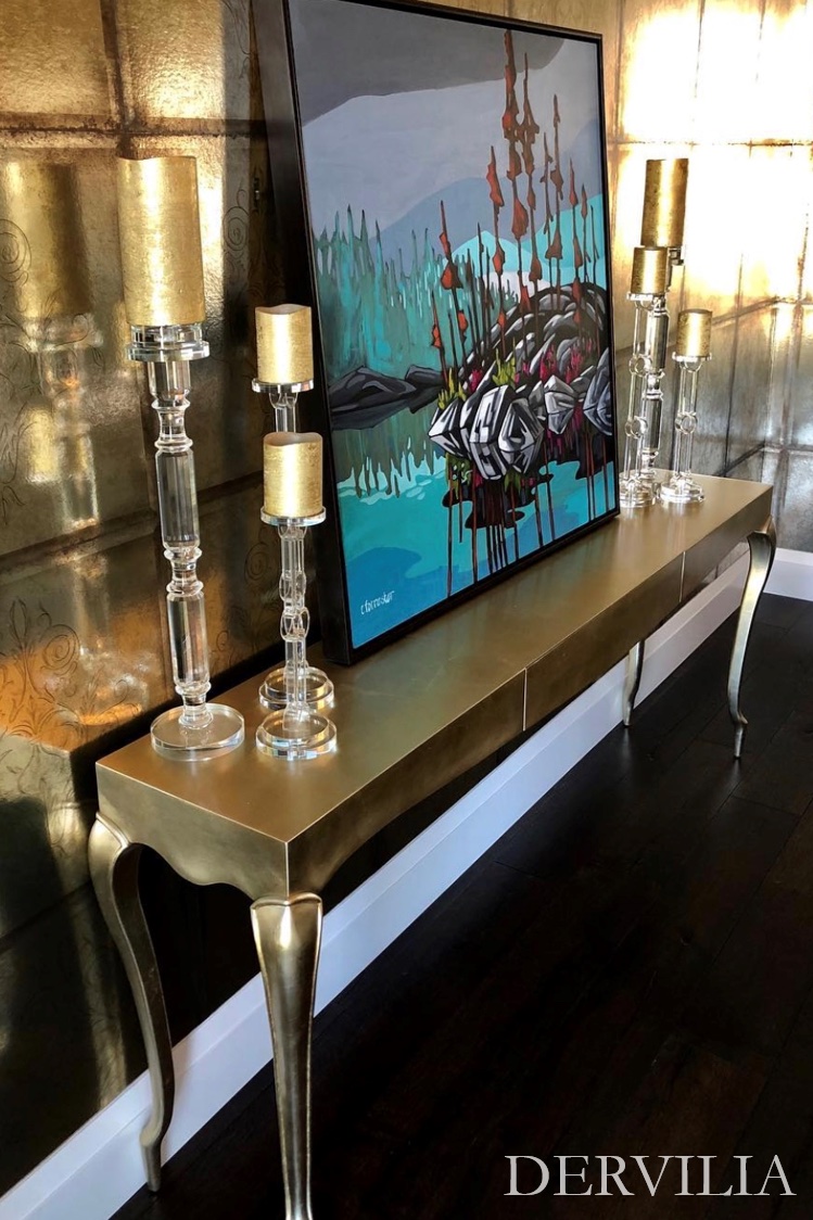 Abstract framed artwork displayed on a metallic console table, styled with tall glass and gold candle holders against a textured wall, highlighting Dervilia’s art-led approach to reflective surfaces and curated interior moments.