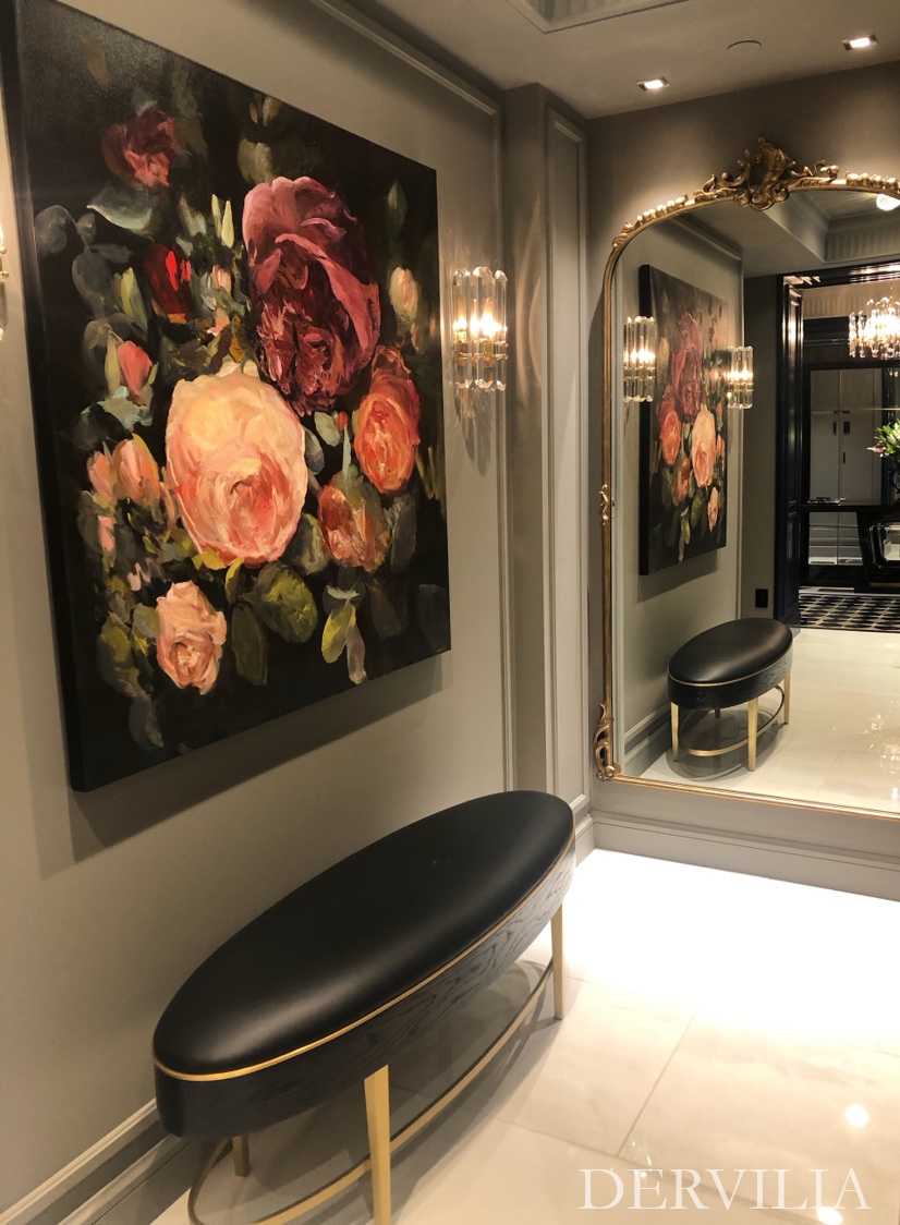Large floral painting displayed in an elegant interior vignette with an ornate framed mirror, wall sconces, and a curved upholstered bench, highlighting Dervilia’s approach to art curation and refined spatial storytelling.
