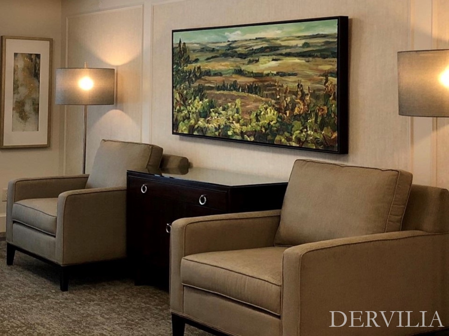 Comfortable seating area styled with upholstered armchairs, soft lighting, and a framed landscape painting as the focal point, reflecting Dervilia’s art-driven approach to creating calm, welcoming interior spaces.