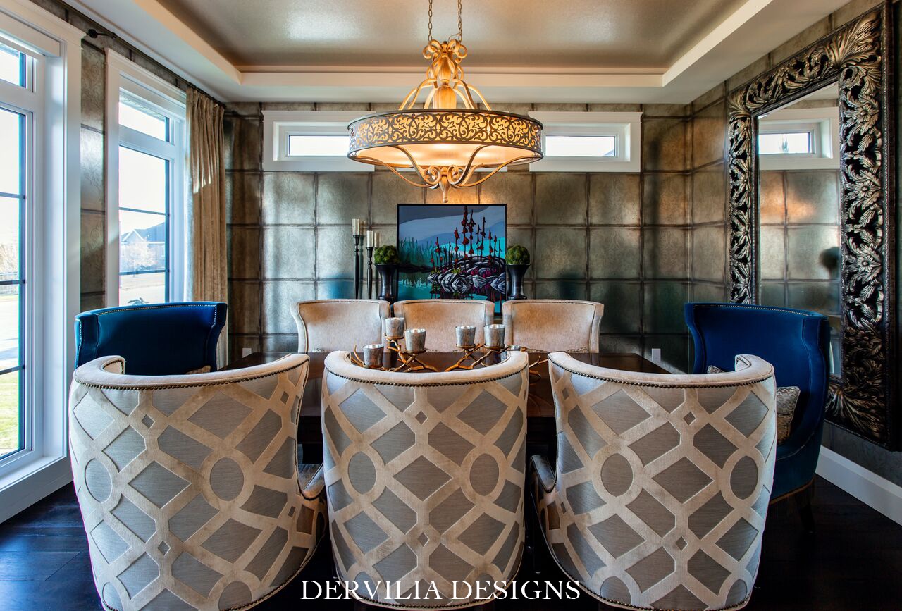 Elegant dining setting featuring sculptural upholstered chairs, an ornate chandelier, textured wall panels, and a framed artwork as the focal point, expressing Dervilia’s art-led approach to refined, symmetrical interior design.