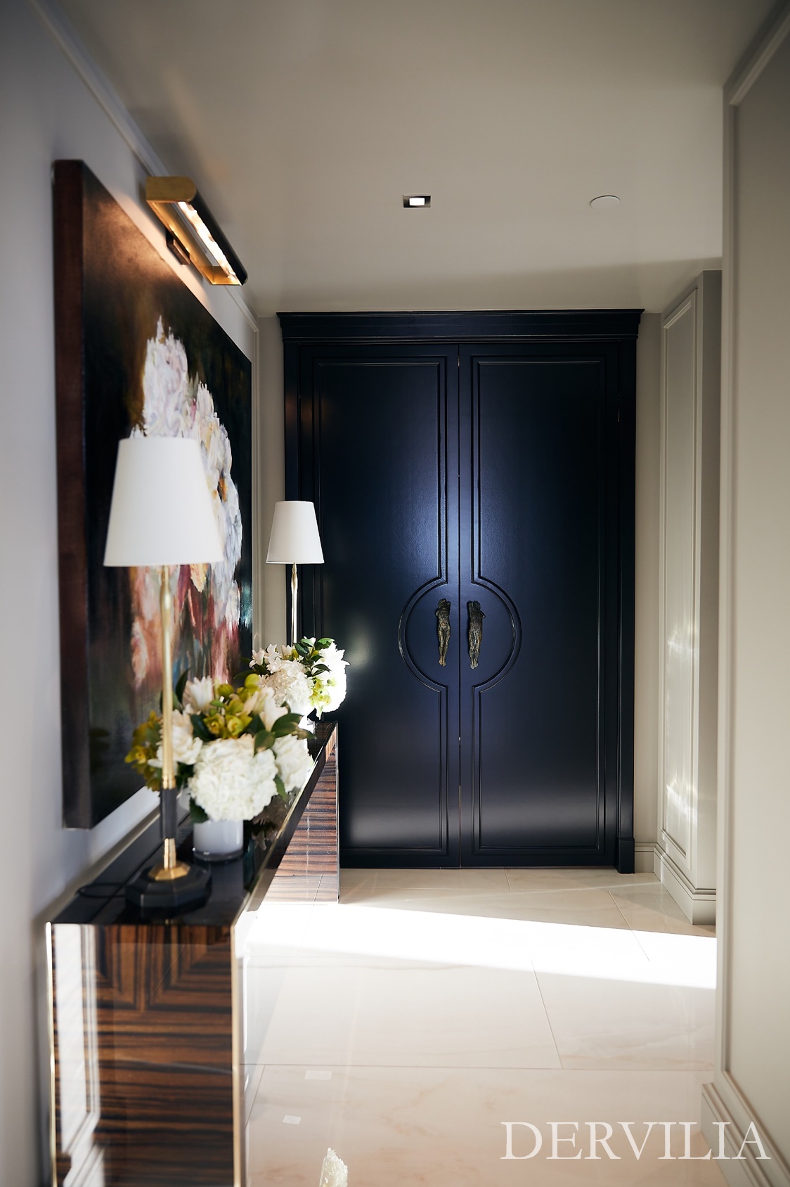 Refined entry hall featuring a large-scale artwork, custom dark cabinetry, and a polished console styled with lighting and florals, expressing Dervilia’s art-driven approach to welcoming, thoughtfully composed interiors.