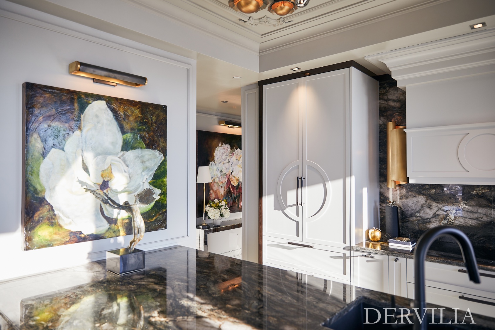 Luxury kitchen interior featuring a large-scale floral artwork integrated into custom white cabinetry, dark marble countertops, brass lighting accents, and detailed ceiling moldings, showcasing Dervilia’s art-led interior design approach.