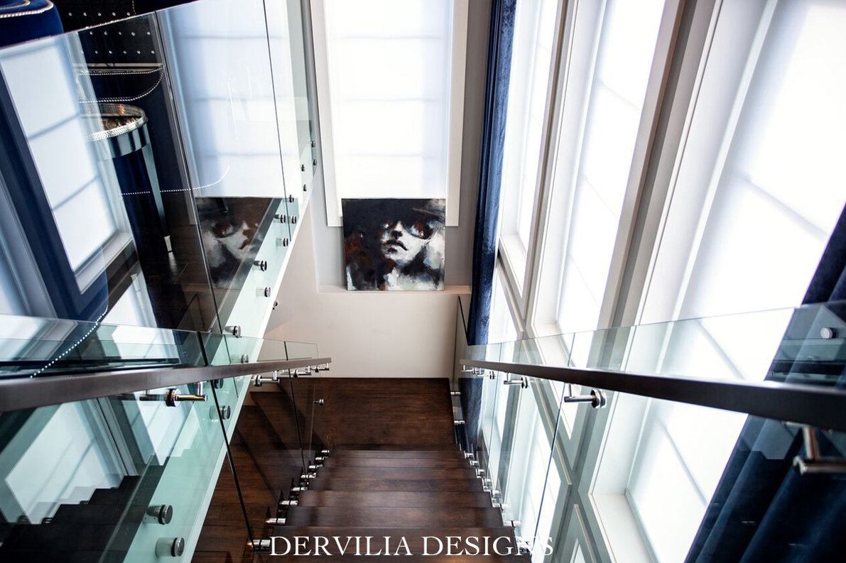 Contemporary staircase with dark wood treads and glass railings, illuminated by tall windows and centered around a dramatic portrait artwork, showcasing Dervilia’s integration of art within architectural design.