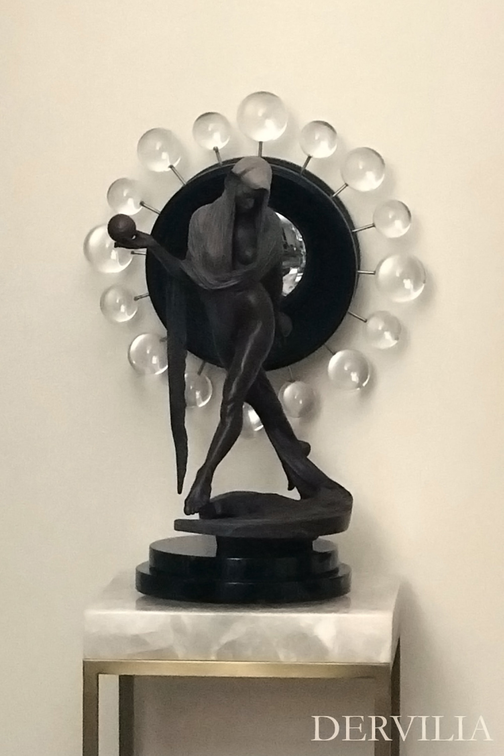 Figurative sculpture displayed on a marble pedestal, framed by a circular mirrored backdrop with glass accents, highlighting Dervilia’s art-led approach to sculptural focal points and expressive interior design.