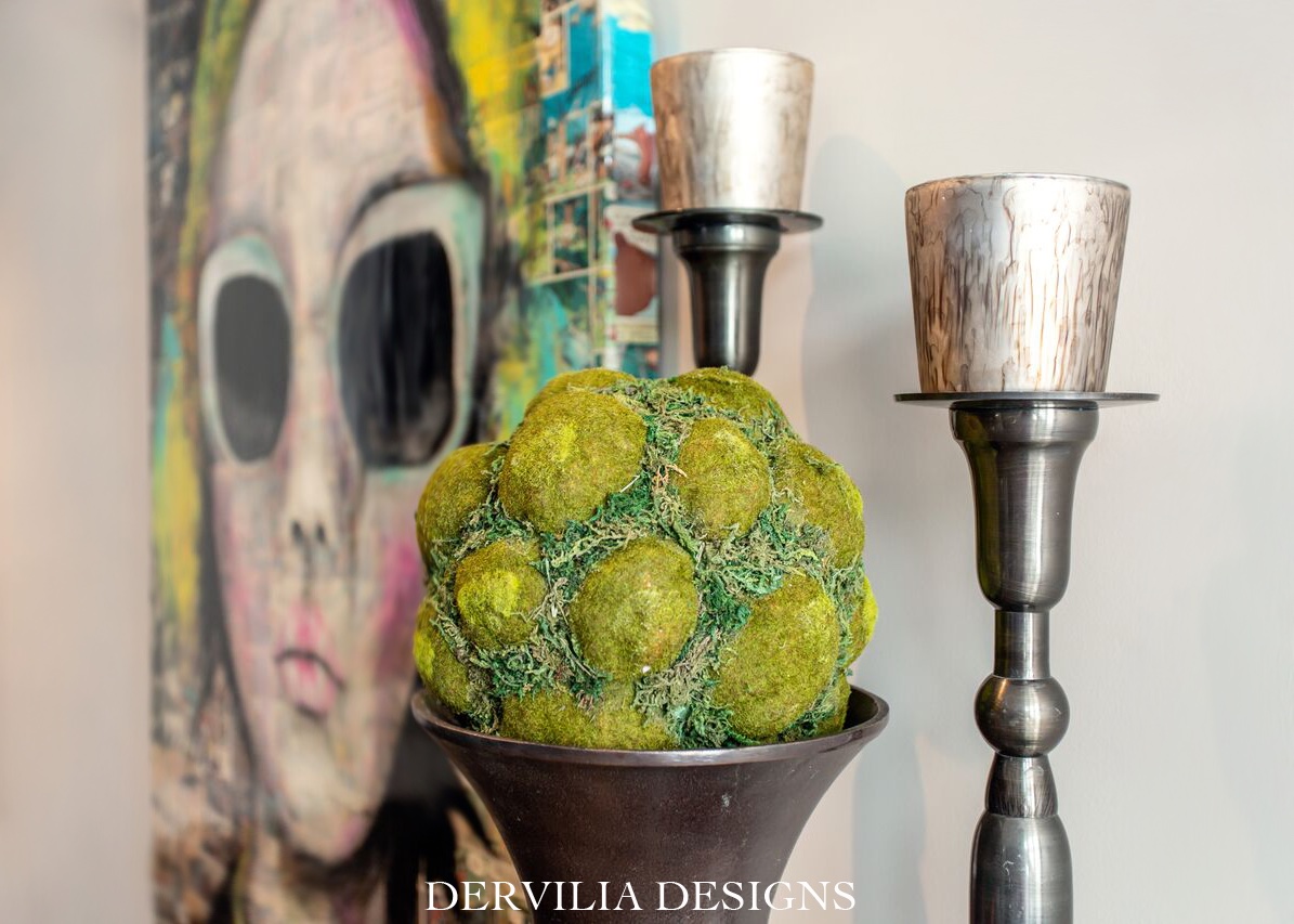 Textural sculptural decor featuring a moss-covered art object in a bowl, styled with metallic candle holders and layered against a bold contemporary artwork, illustrating Dervilia’s curated art and design aesthetic.