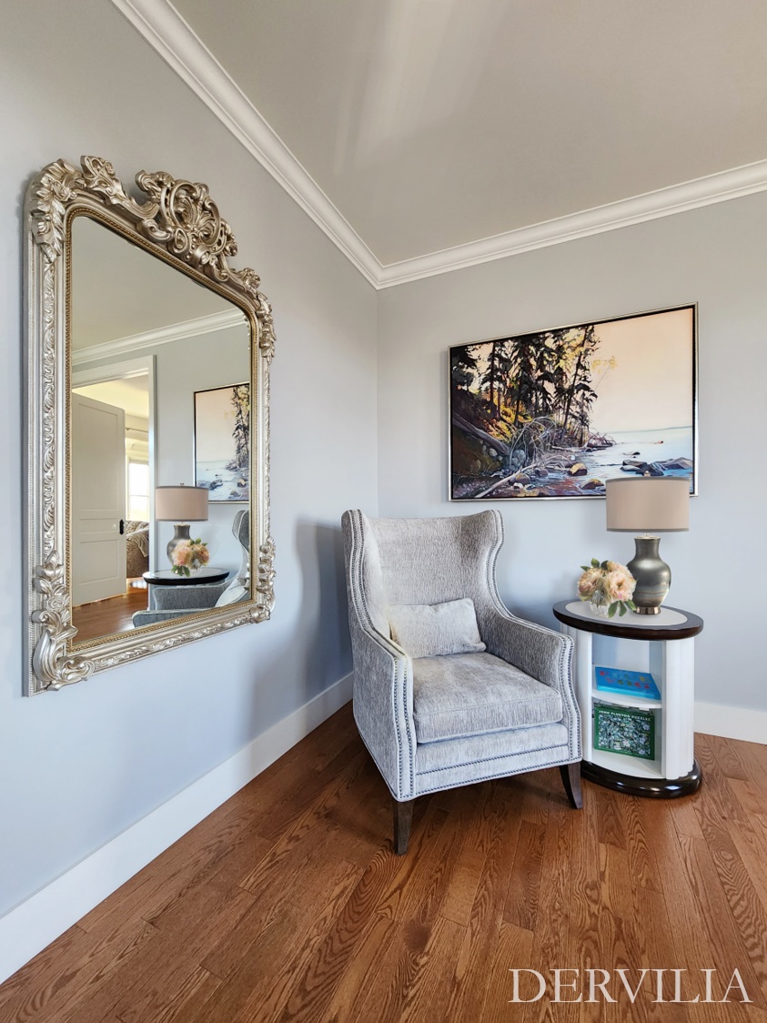 Refined interior vignette featuring an upholstered accent chair, ornate framed mirror, landscape artwork, and a styled side table with lamp and florals, expressing Dervilia’s art-led approach to calm, considered spaces.