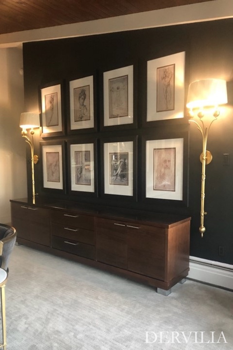 Wall of framed classical drawings arranged above custom wood cabinetry, accented by sculptural wall lamps, expressing Dervilia’s refined approach to art curation, symmetry, and layered interior atmosphere.